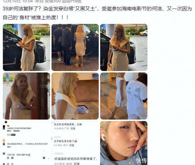 接着聊聊细节吧。这次热搜的核心就是何洁的外貌变化。她金发是新染的,看起来有点蓬松,配上白裙,本来想走个优雅路线,结果网友觉得颜色太亮,在灯光下显黑。 裙子是露肩设计,材质轻薄,但因为她身材最近圆润了点,腰部和手臂那儿没收紧,拍照时就暴露了副乳和肚子肉。